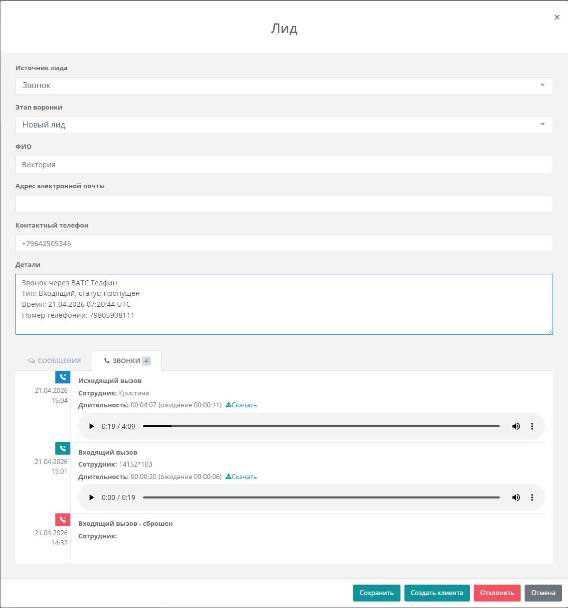 Автоматическое создание лида при входящих/пропущенных звонках.