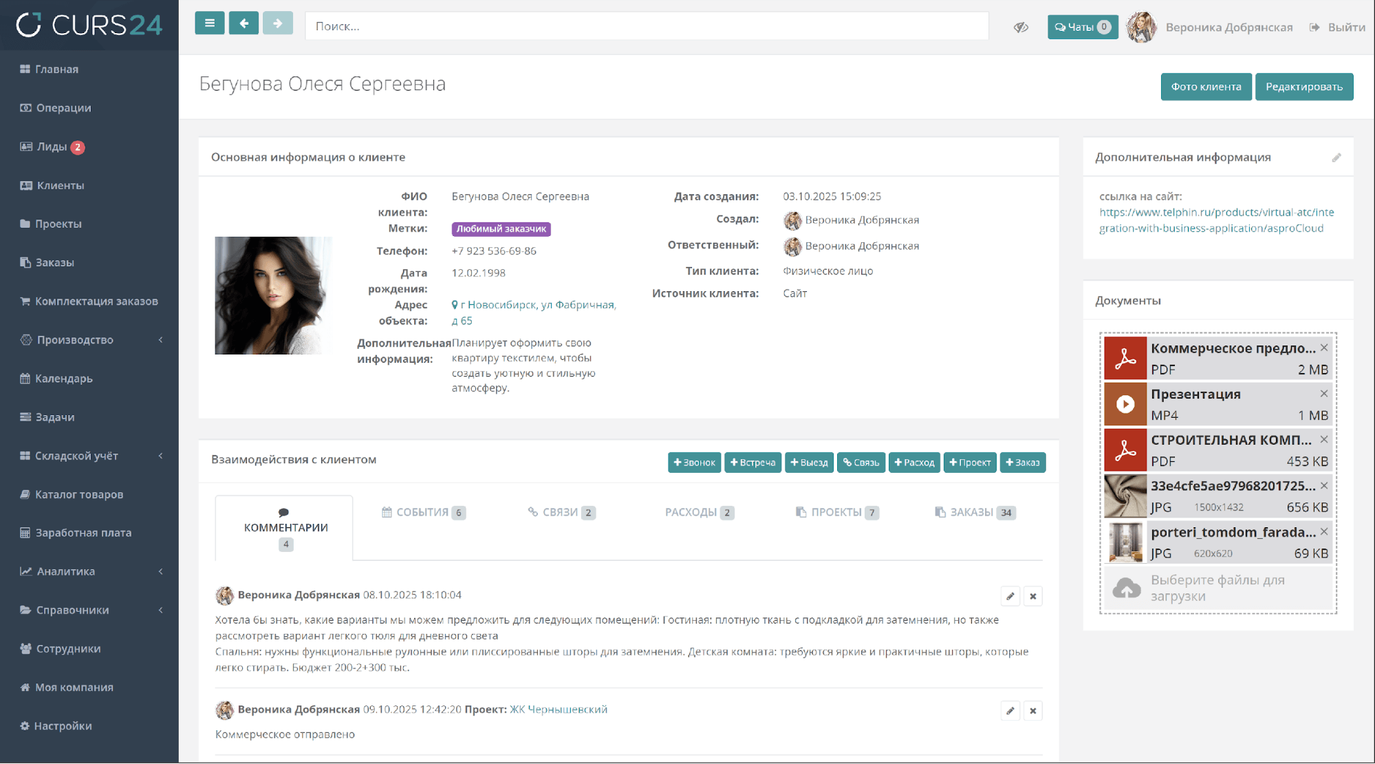 Ведение базы клиентов — вся история взаимодействий, расчеты, заказы, звонки и переписки в одной карточке.