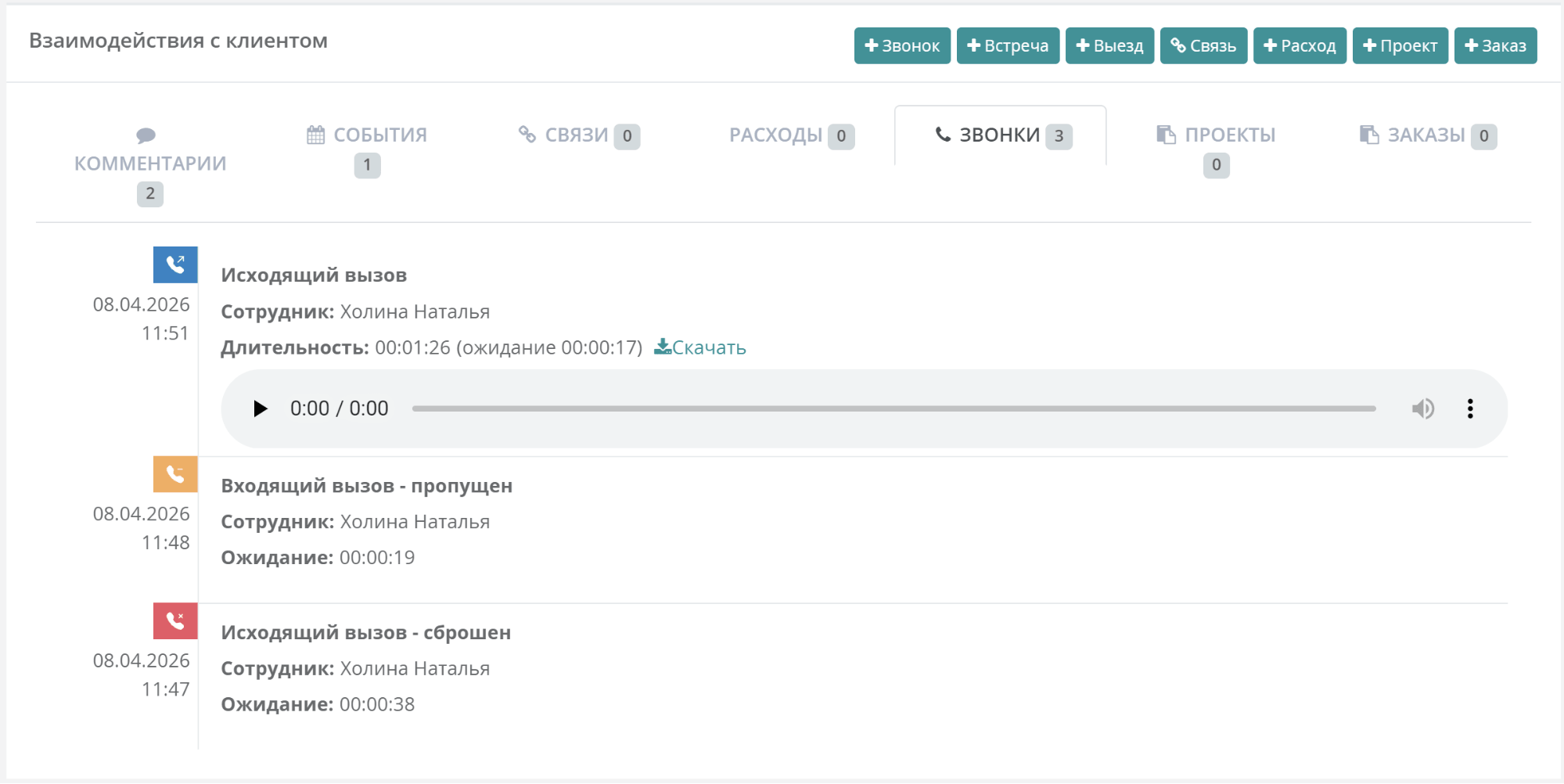 Все записи разговоров прикрепляются к карточке клиента с возможностью прослушать и скачать аудиофайлы.