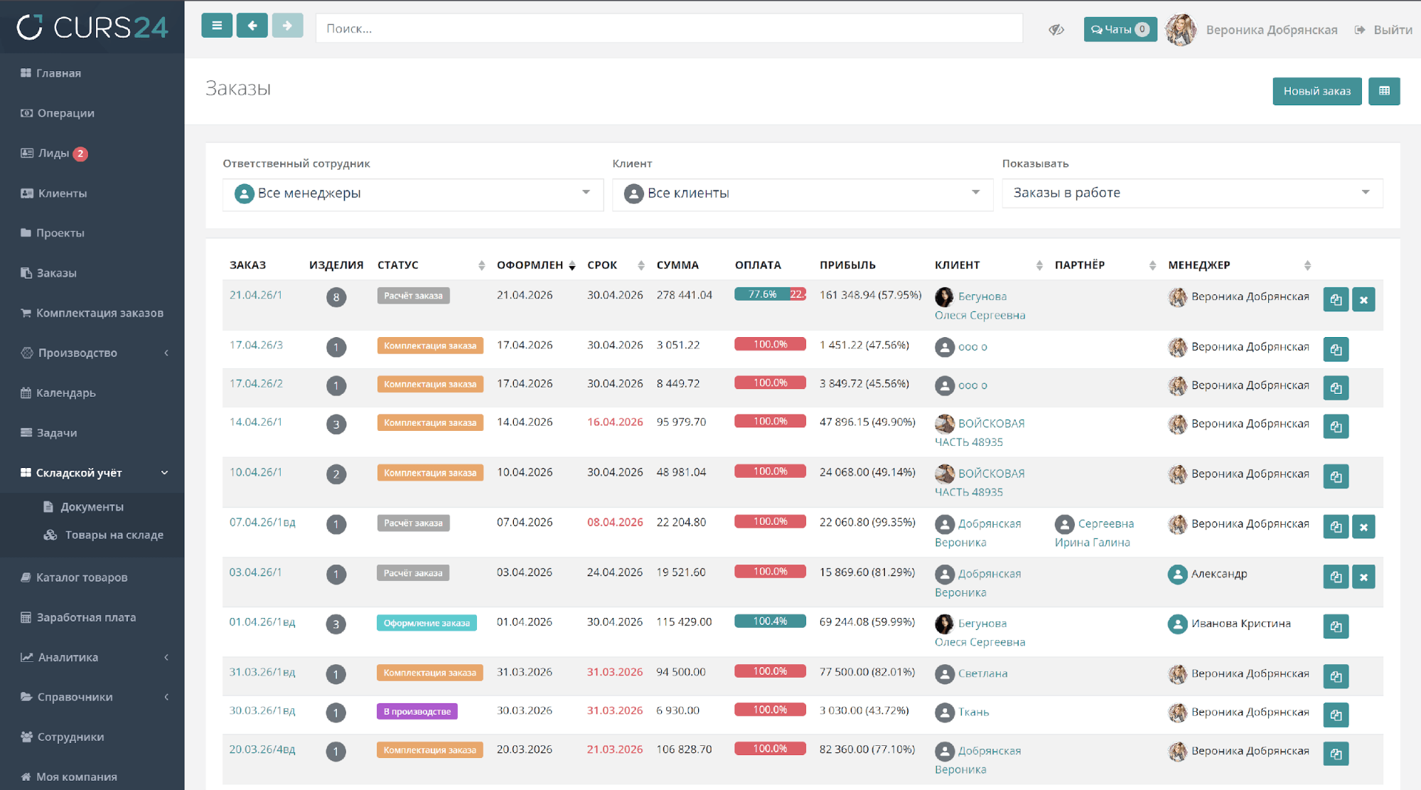 Оформление и ведение заказов — создание коммерческих предложений, договоров и закрывающих документов, ведение и контроль заказа на всех этапах исполнения, учет расходов и оплат по заказам, интеграция с приемом интернет-платежей.