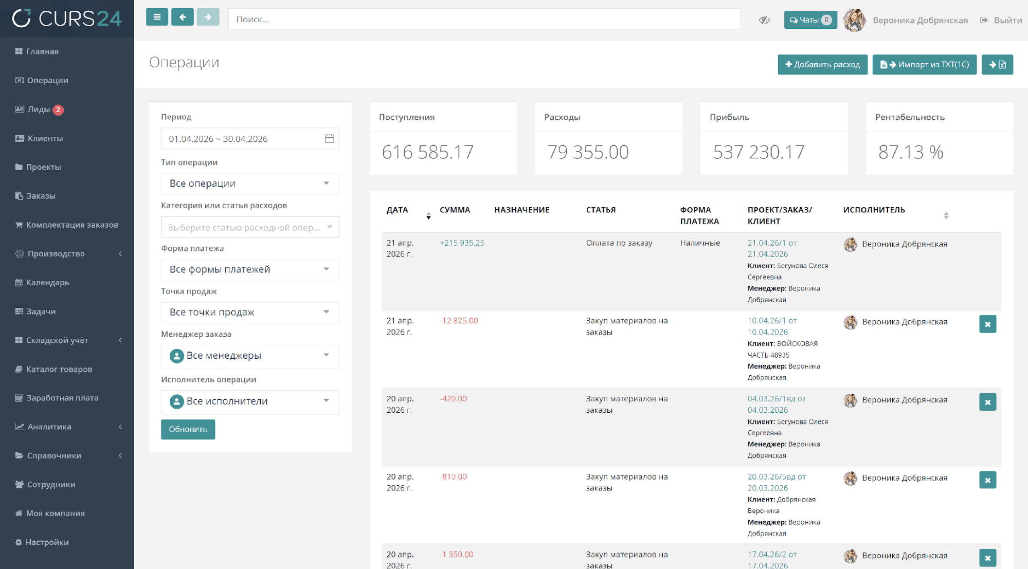 Финансовые операции — доходы, расходы и оплаты по заказам с расчетом рентабельности бизнеса.