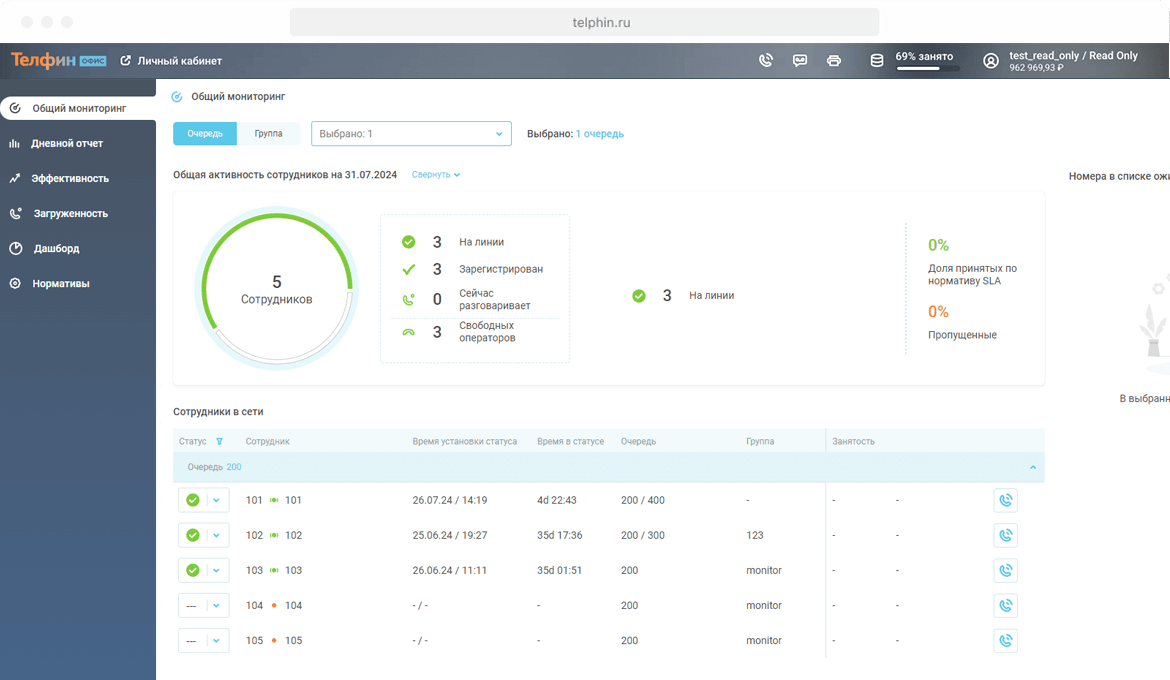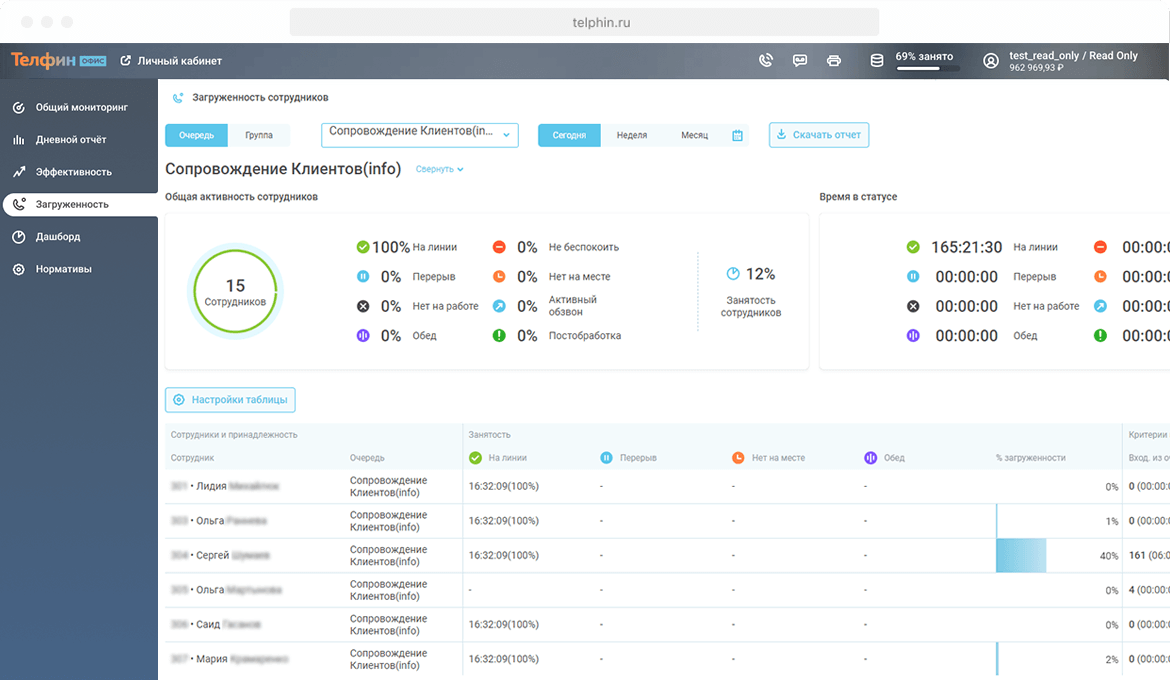 Данный показатель рассчитывается так же, как и общий процент занятости сотрудников в виджете «Общая активность сотрудников», но для отдельного добавочного. То есть представляет собой отношение времени, проведенного сотрудником в звонках ко времени, проведенному в статусах с пометкой «Рабочее время».
