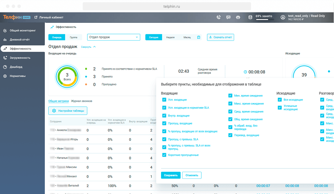 Да. В разделе «Эффективность» вы можете отфильтровать звонки по конкретному сотруднику, статусу вызова (принятые или непринятые), направлению (входящие или исходящие).